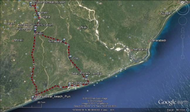 We left Dolamundai at around 0730 hours. As per the practice, I reset the odometer and started the track recording. Dilip was the name of the cab driver who spoke nothing at all,probably due to language hindrance; he preferred to chew paan/guthka and focus on driving with incessant honking – a trait I saw in all the cab drivers there. We started to backtrack on the road same as the one we took on Friday night from Bhubaneshwar to Cuttack. I was viewing my GPS sporadically. I guess/recall that it was NH-5. While heading from Bhubaneshwar to Cuttack on Friday, the cab driver pointed at a bifurcation for Puri and I believe we were headed for the same. The road was quite uneventful and all I can recall is one Daya bridge. There weren’t any breakfast options but we were already feeling hungry. Finally, we took a pitstop and gulped on some deep fried Medu Vadas and had some really refreshing tea which had a sharp taste.