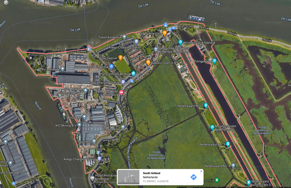 The village of Kinderdijk lies in one such polder(the Alblasserwaard polder) between the Lek and Noord rivers. In the 12th/13th century, the residents, especially, the farmers faced a formidable challenge of keeping their farms and settlement areas from flooding(either due to rains or natural rise in the water level due to sand deposits). Take a look at Kinderdijk’s location to get an idea of the flooding it might have suffered in the Middle Ages.
