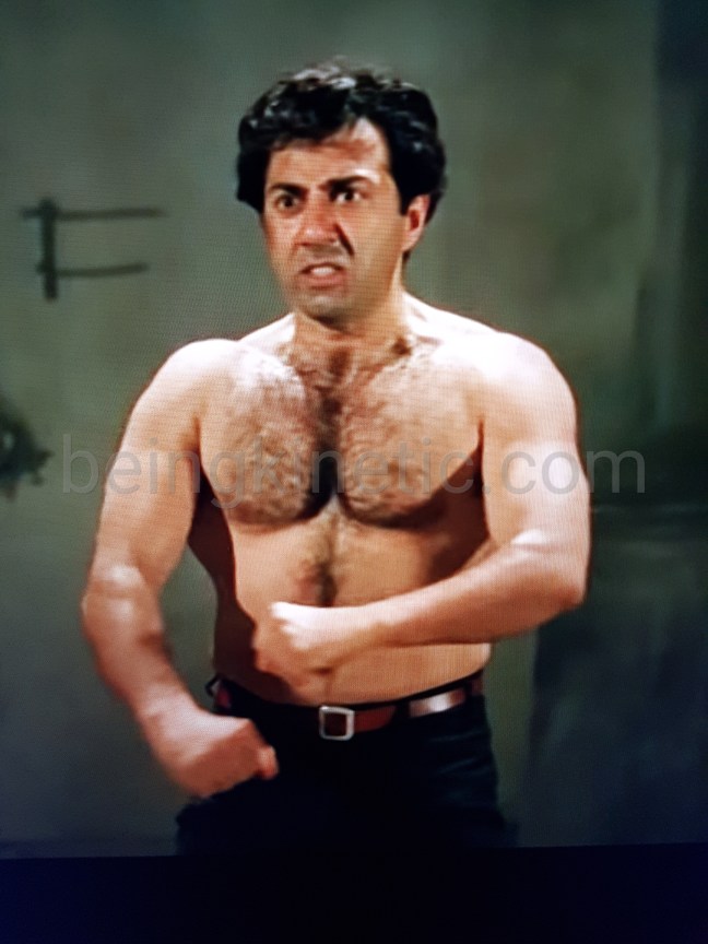 - The preposterous glamour unleashed on the masses and enforced, especially on the male actors – 6-pack abs, wings and curves, upstart hairstyles, expensive clothes, cars, money and what not! Dharmendra, Sunny were Bollywood’s masculine representatives. Their physiques appear naturally built, similar to the vintage Indian men who used to eat healthy food, exercise or work hard. Take example of ‘Ghatak’ itself – do you see Sunny’s 6-pack abs or a similar glamorous features flaunted by today’s male actors?