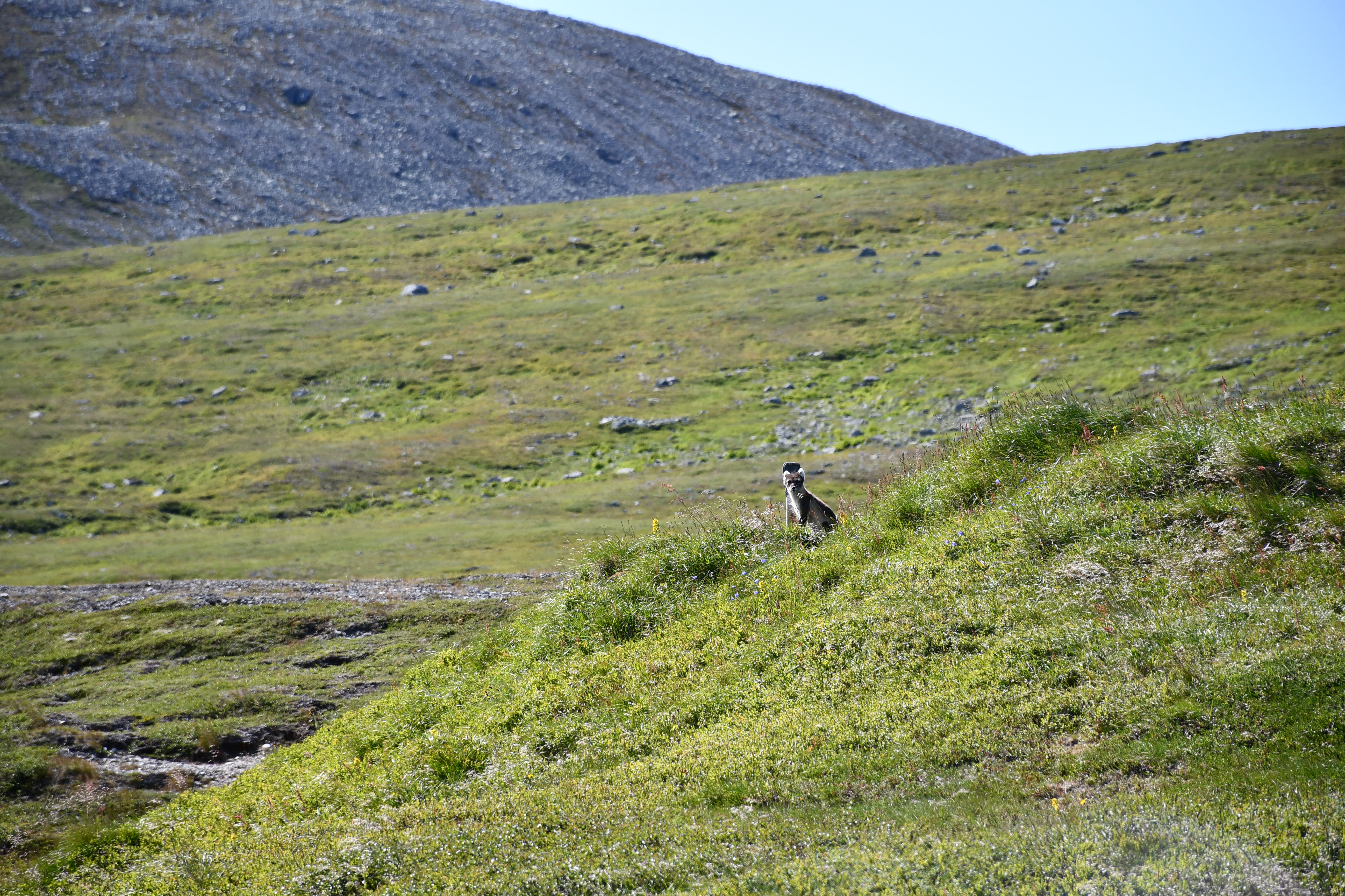 There were mounds everywhere. I could barely cover 1km in 40 minutes. While I was worrying about the pace, I suddenly noticed some moment on my left. An Artic Fox family was staring at me – two adults(possibly, a pair), and at least 3 young ones. I was jubilant, and in that excitement, I quickly moved in that direction to get a better look. The young ones scurried into some hole/burrow, and were gone !!! Both the adults now took a guarding position and were observing me. I slowly retreated and started to circumvent them. I took out my camera and hastily clicked a few shots. Soon, an adult disappeared, the other one stood guard. I decided not to intrude further, and proceeded my way towards the summit.