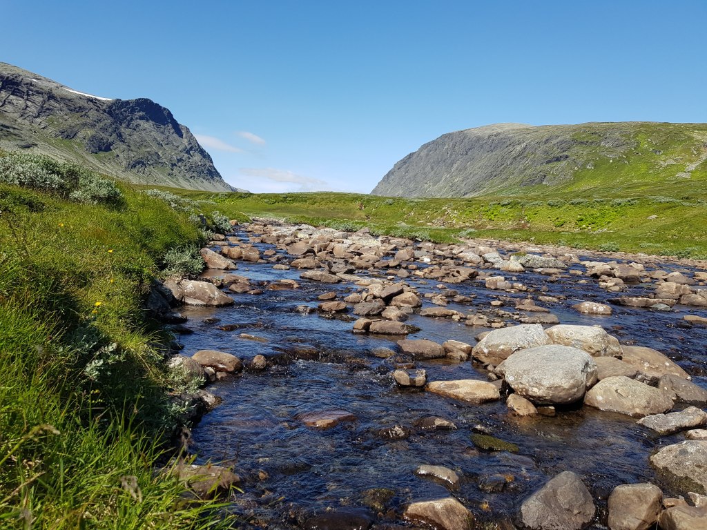 The stream I mentioned earlier, now had started to widen. The trees disappeared, now it was only shrubs and grass. While the trail was still trackable, it was swampy around. The water of the stream was cold and fresh. We soon reached the Sami hut. It is a private residence. It was empty when we reached there. Note that even if someone is there, it is advisable to move on. Samis don’t like visitors intruding their hard work pertaining to reindeer husbandry.