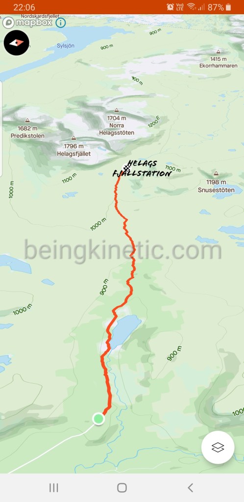 (Thankfully)There is no motorable road to the base of Helags. From Ljungdalen, one has to drive till Kläppen, park the vehicle, walk 12km along a marked trail to the base of Helags. From the base to summit, it is around 4km, thus, to and fro, it is at least 8km. A stay, at least for a night, at STF Helags Fjällstation is crucial.