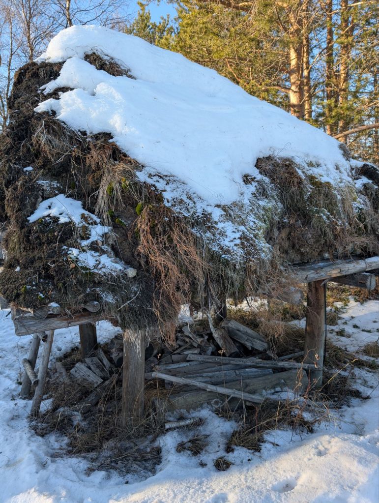 The buoggi was made out of birch poles, birch bark and turf. The frame was open and airy and the stand’s legs were smooth to prevent rats from climbing up.