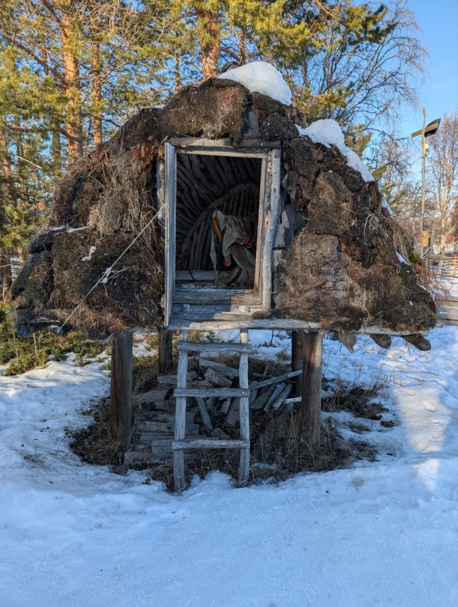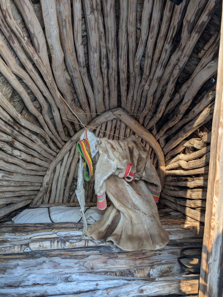 Here the equipment needed for milking the reindeer and for work during the summer was kept. Everything belonging to the winter season such as winter clothing and reindeer harnesses were stored here.