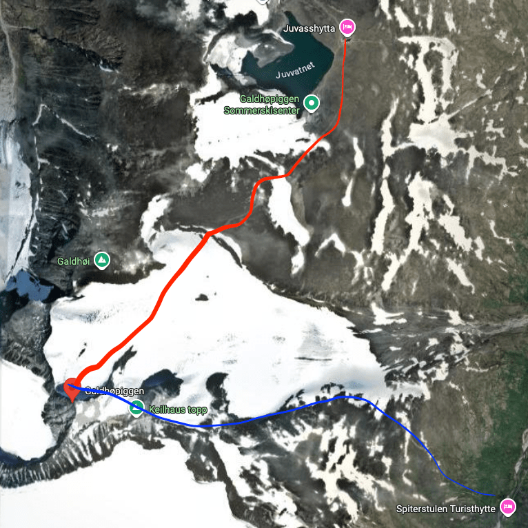 | via Juvasshytta(marked in red in the above image) | via Spiterstulen Turisthytte(marked in blue in the above image) | |