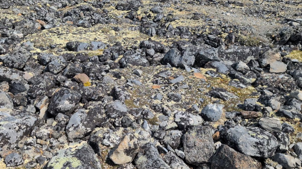 The soil here on Juvflye has permafrost, though, each summer the surface layer thaws. The water then trickles down into crevices between rocks and dirt. In the winter the water freezes and expands the cracks, since water increases in volume when it freezes. Over time the process repeats, and the ground slowly shifts and sorts the material into impressive shapes. The result is called polygonal soil. The most developed specimens have a hexagonal shape.
