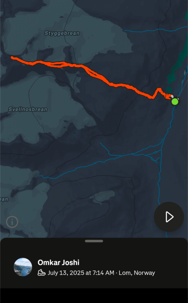 I left from the Juvasshytta parking lot around 1330. I partially recorded the descending drive using my phone. The video does include my blabbering, so bear with me :D. It was a memorable drive because of the serpentine road, cliffs, and the enthralling mountains.